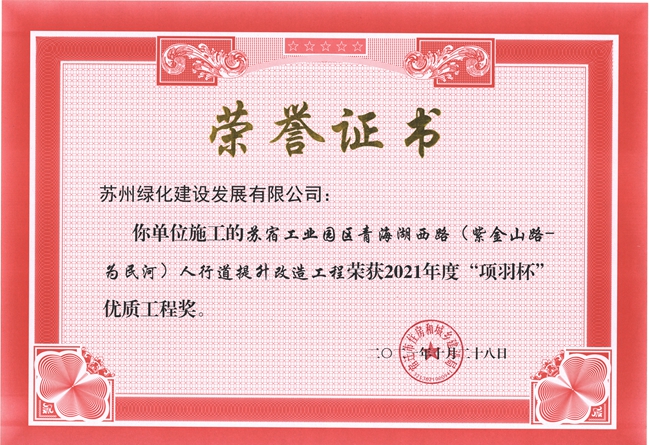 園區(qū)青海湖西路人行道提升改造工程喜獲2021年度宿遷市“項(xiàng)羽杯”優(yōu)質(zhì)工程獎(jiǎng)