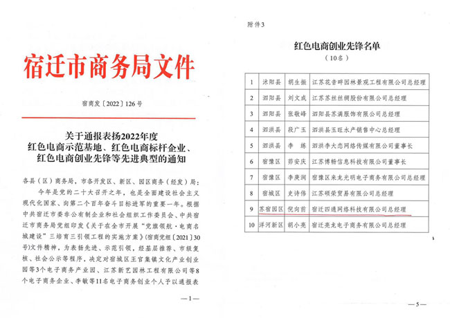 黨的二十大召開之年,市商務局為擦亮“電商名城”牌子,激發(fā)“電商名城”發(fā)展新動能,12月15日,組織紡織服裝產(chǎn)業(yè)鏈黨建工作暨“黨旗領航·電商名城建設”推進會。園區(qū)企業(yè)家四通科技董事長倪向前獲得“紅色電商創(chuàng)業(yè)先鋒”榮譽稱號。