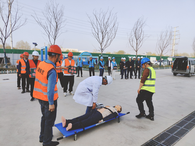 本次演練共分6個小組,分別為:現(xiàn)場模擬組、現(xiàn)場警戒(搶修)組、應(yīng)急救援(疏散)組、通訊聯(lián)絡(luò)組、事故調(diào)查組、 觀摩組。假設(shè)工人在生活區(qū)違規(guī)使用大功率電器突發(fā)火災(zāi),被煙霧和火勢圍困,二樓有人發(fā)出救援信號,正在附近巡查的安全員發(fā)現(xiàn)情況后,立即趕赴現(xiàn)場并打電話給項目生產(chǎn)負(fù)責(zé)人,在接到通知后,項目生產(chǎn)負(fù)責(zé)人迅速安排項目部應(yīng)急救援辦公室負(fù)責(zé)人,并啟動應(yīng)急預(yù)案,各救援小組立即到達現(xiàn)場開展工作,安全員迅速引導(dǎo)全體人員有序從疏散樓梯疏散到安全位置,救援組帶著擔(dān)架、急救箱等趕赴現(xiàn)場,將“受傷”人員用擔(dān)架從房內(nèi)撤離到安全位置,同時救援醫(yī)生對“受傷”人員進行簡單的心肺復(fù)蘇、人工呼吸,并迅速送往醫(yī)院進行治療。
