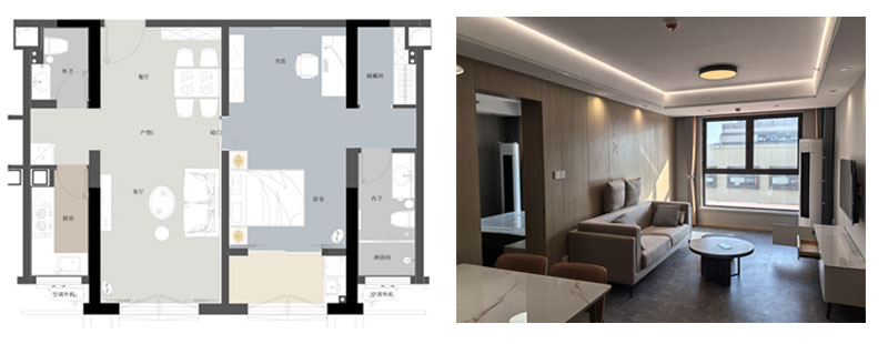 青年公寓一期3#白領公寓共三種戶型,A戶(2室1廳1廚1衛(wèi)面積84m2)44間、B戶(1室1廳1廚1衛(wèi),面積35m2)88間、C戶(1室1廳1廚2衛(wèi),面積72m2)44間,共計154間,裝修面積約1.3萬平方米。白領公寓旨在服務于入駐企業(yè)高精尖人才,是園區(qū)迄今為止已建成的單體建筑規(guī)模最大、配套設施最為完善的白領公寓,內(nèi)設廚灶、抽油煙機、櫥柜、床、書桌、衣柜、空調(diào)、冰箱及電視等基本生活設施,為入住人群提供拎包即住的便利。