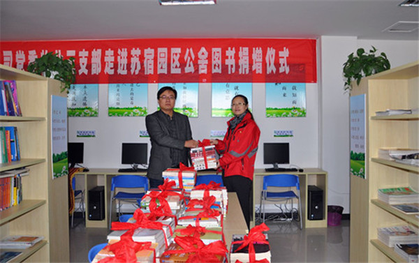 活動現(xiàn)場,陳彤彤代表蘇大教服集團黨委物業(yè)三支部捐贈了《紅樓夢》、《中國文學》、《管理學》等書籍20余種310冊和羽毛球拍、乒乓球拍等文體用品;張驥代表建發(fā)公司向蘇大教服集團黨委物業(yè)三支部贈送了題為“黨員工友一家親,蘇宿兩地心連心”的錦旗,以示感謝。