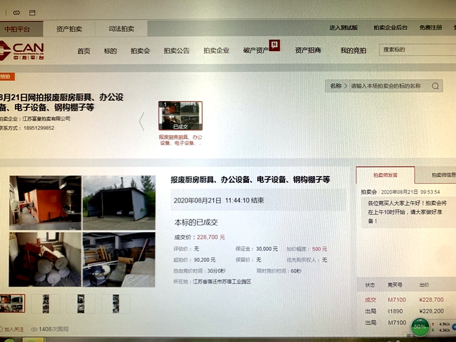8月21日上午10時(shí),城發(fā)公司報(bào)廢廚具、辦公設(shè)備、電子設(shè)備、鋼構(gòu)棚子等物資網(wǎng)上拍賣開始,7家競(jìng)買人,經(jīng)過1小時(shí)44分10秒244次的緊張激烈競(jìng)價(jià),最終以228700元成交標(biāo)的,比評(píng)估價(jià)90200元高出138500元,溢價(jià)率153.55%。
