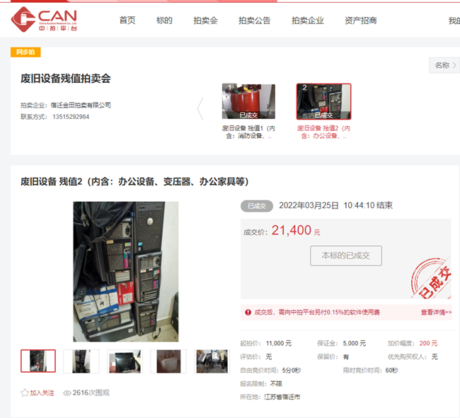 3月25日上午10時30分,開發(fā)公司一批廢舊辦公設備、辦公家具、變壓器等物資在中拍平臺公開拍賣,7家競買人,經過14分10秒緊張激烈競價,最終以21400元成交。