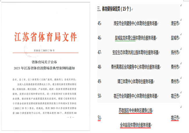 近日,江蘇省體育局印發(fā)《關(guān)于公布2023年江蘇省體育消費(fèi)場(chǎng)景典型案例的通知》,遴選公布100個(gè)體育消費(fèi)場(chǎng)景典型案例,其中精品案例20個(gè)、典型案例80個(gè)。蘇宿園區(qū)中央商務(wù)區(qū)健身公園全年齡段體育綜合服務(wù)場(chǎng)景入選2023年江蘇省體育消費(fèi)場(chǎng)景典型案例。