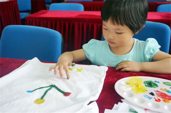 來自園區(qū)各居民小區(qū)的十余名小朋友參加了開班課程,他們?cè)诩议L(zhǎng)的陪同下,參加了第一期“親子DIY”課程,用自己的小手、畫筆在白凈的T恤上自由發(fā)揮,一幅幅“杰作”便在“神筆馬良”筆下誕生。